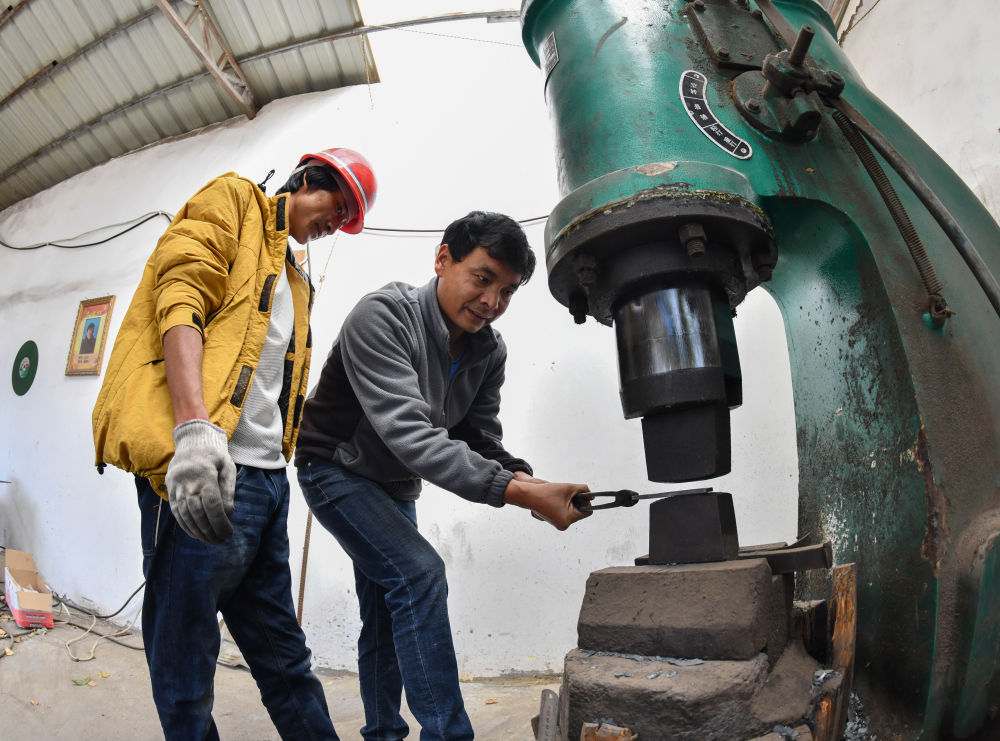 在孜托鎮(zhèn)加日扎村民族手工藝品加工合作社里,寸昆杰向徒弟們示范洛隆藏刀的鍛造工序,他是首位掌握洛隆藏刀技藝的白族人:隨著鼓風(fēng)機(jī)吹動,室內(nèi)一股熱浪撲面而來,被燒得通紅的刀片在空氣錘的敲打下火花四濺……