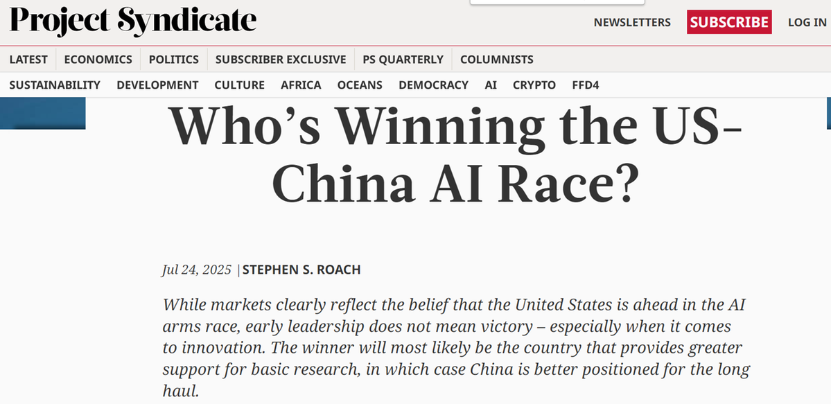 美國摩根士丹利亞洲區(qū)前主席斯蒂芬·羅奇在報(bào)業(yè)辛迪加網(wǎng)站(Project Syndicate)發(fā)表文章指出,全球人工智能(AI)競賽的勝負(fù)取決于基礎(chǔ)研究的投入,而非短期市場表現(xiàn)。羅奇認(rèn)為,中國憑借產(chǎn)業(yè)生態(tài)、研發(fā)投入和文化傳統(tǒng),使其在長期競爭中占據(jù)優(yōu)勢(shì)。