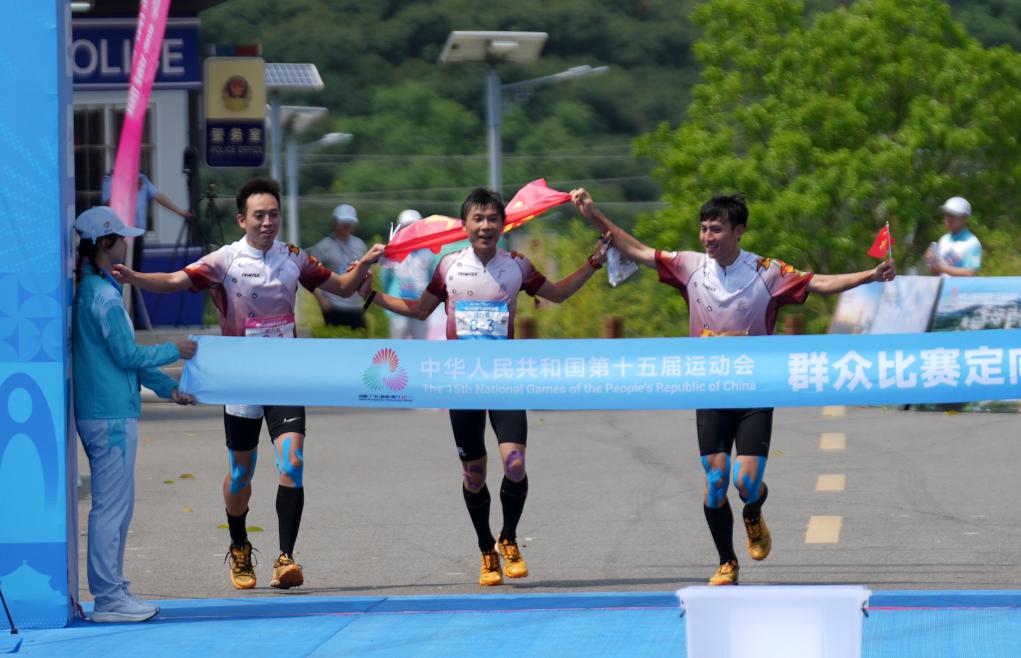 5月8日,廣東隊(duì)選手李卓業(yè)(中)、唐建達(dá)(左)、唐瀟在男子定向接力賽中沖向終點(diǎn)。當(dāng)日,第十五屆全國運(yùn)動會群眾賽事活動定向接力賽決賽在廣東省茂名市高州根子鎮(zhèn)舉行。新華社記者 黃國保 攝