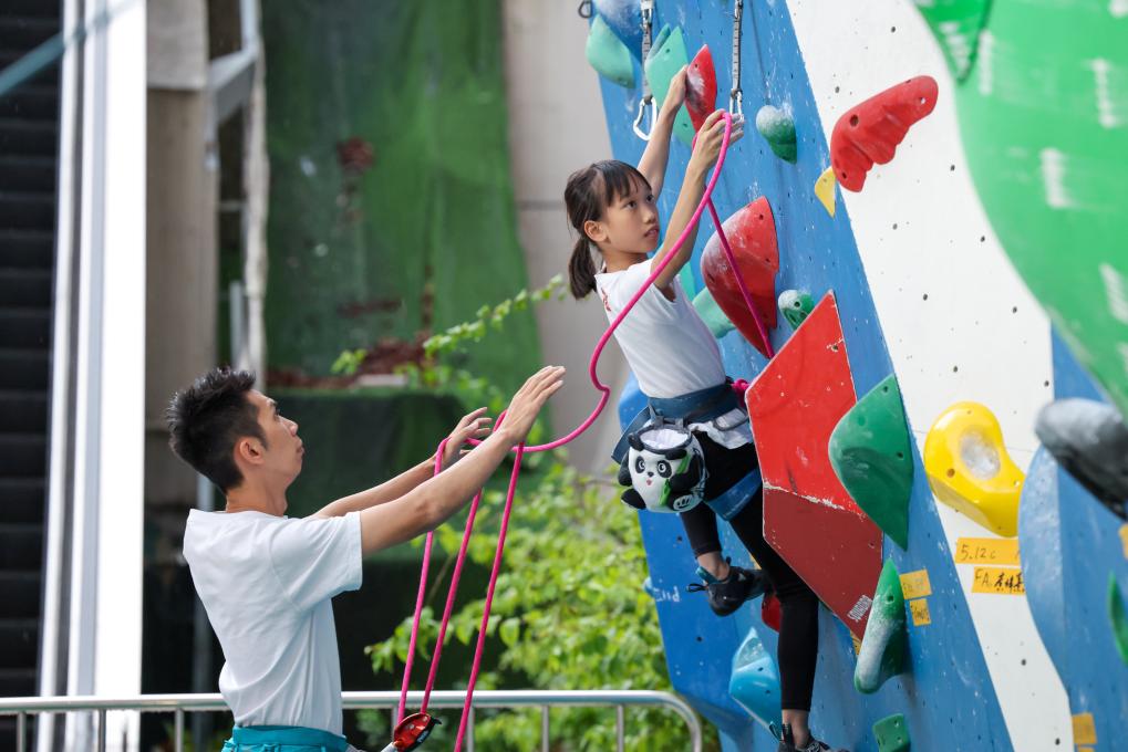 圖為在深圳福田區(qū)呢度有家攀巖館,來自中國香港的9歲女孩何芊芊(右)在爸爸何善揮的保護(hù)下開始難度攀巖訓(xùn)練(6月17日攝)。新華社記者 梁旭 攝