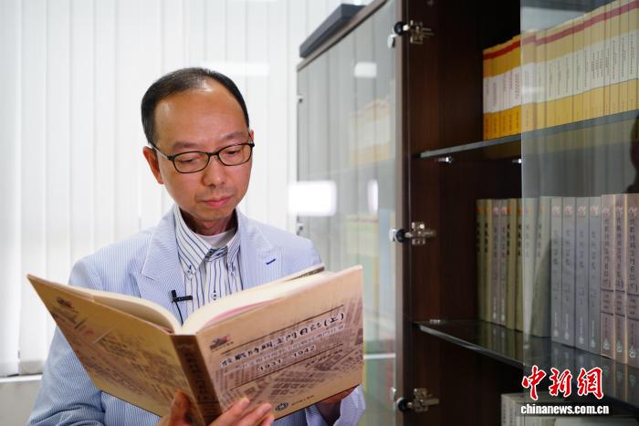 7月24日,澳門理工大學(xué)人文及社會(huì)科學(xué)學(xué)院院長、澳門口述歷史協(xié)會(huì)會(huì)長林發(fā)欽翻閱《抗戰(zhàn)時(shí)期澳門日志(上)》。 中新社記者 鄭嘉偉 攝