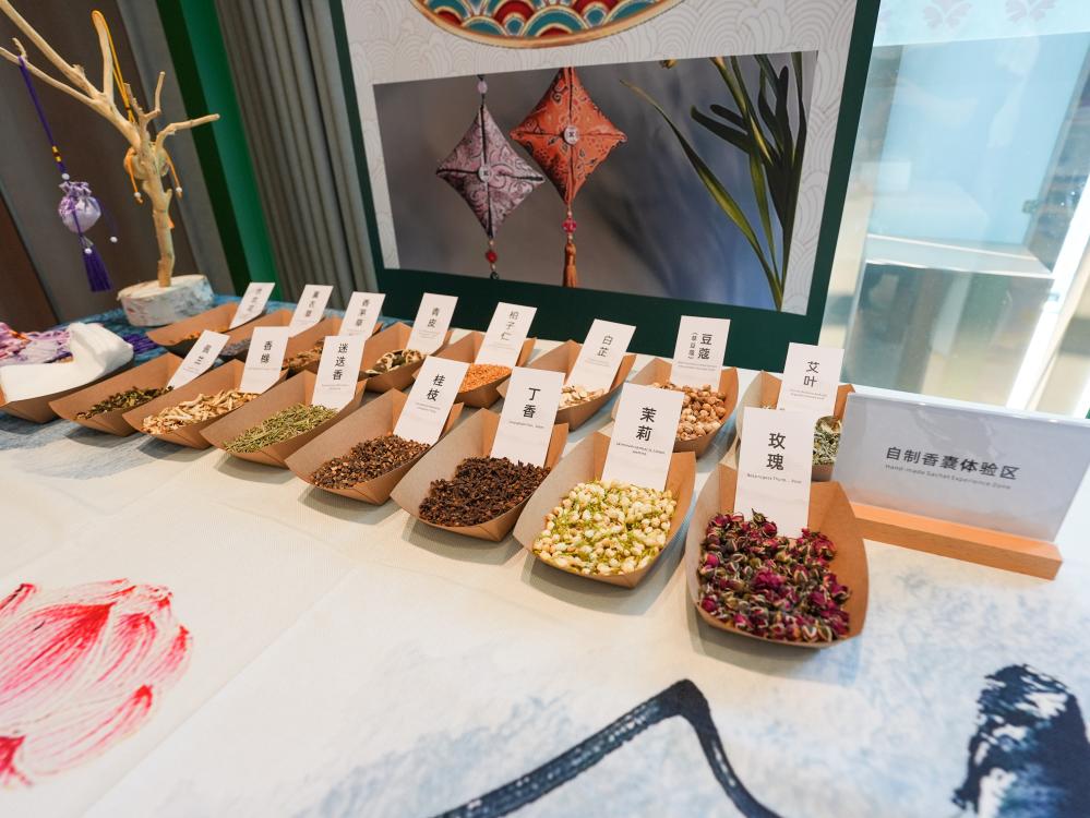 8月3日,在成都世運(yùn)會(huì)運(yùn)動(dòng)員村A區(qū)中醫(yī)藥體驗(yàn)館拍攝的自制香囊體驗(yàn)區(qū)。新華社記者 王曦 攝