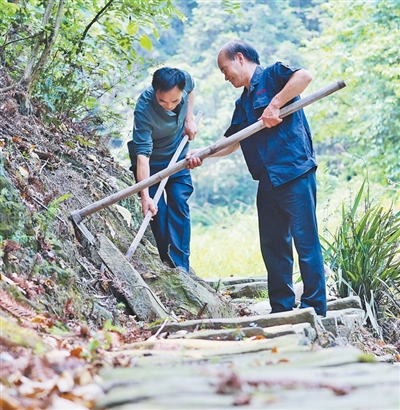 每次上山修路,陳興海和弟弟陳興合都會帶上鐵鍬、鎬頭、鋤頭、斧頭?!笆^硬得很,我一鎬頭下去,手震得疼!”這樣的日子,兄弟倆一過就是8年??傞L約15公里的古道,已經(jīng)修好了約2/3?!拔覀冞€要繼續(xù)往下修?!标惻d海說。
