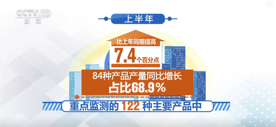 上半年,重點(diǎn)監(jiān)測的122種主要產(chǎn)品中,84種產(chǎn)品產(chǎn)量同比增長,占比68.9%,比上年同期提高7.4個(gè)百分點(diǎn)。