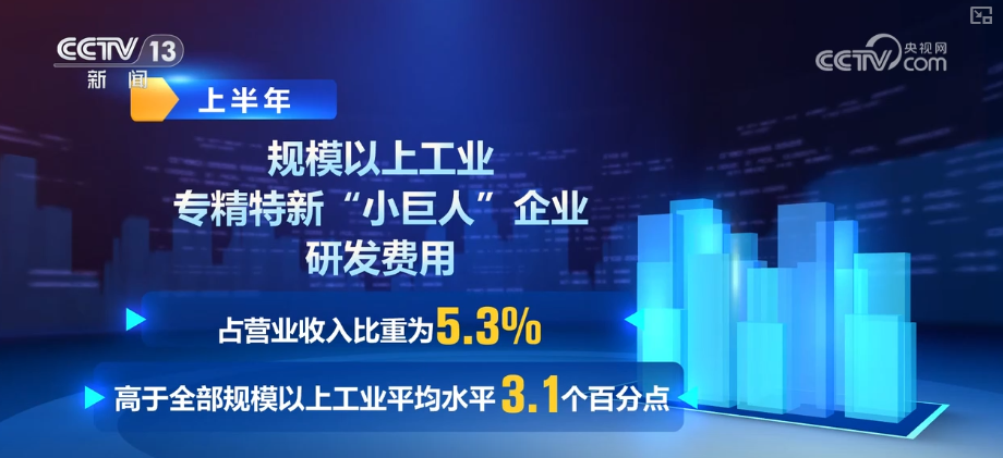 此外,中小企業(yè)創(chuàng)新能力不斷提高。上半年,規(guī)模以上工業(yè)專精特新“小巨人”企業(yè)研發(fā)費(fèi)用占營業(yè)收入比重為5.3%,高于全部規(guī)模以上工業(yè)平均水平3.1個(gè)百分點(diǎn),發(fā)展新質(zhì)生產(chǎn)力作用逐漸顯現(xiàn)。