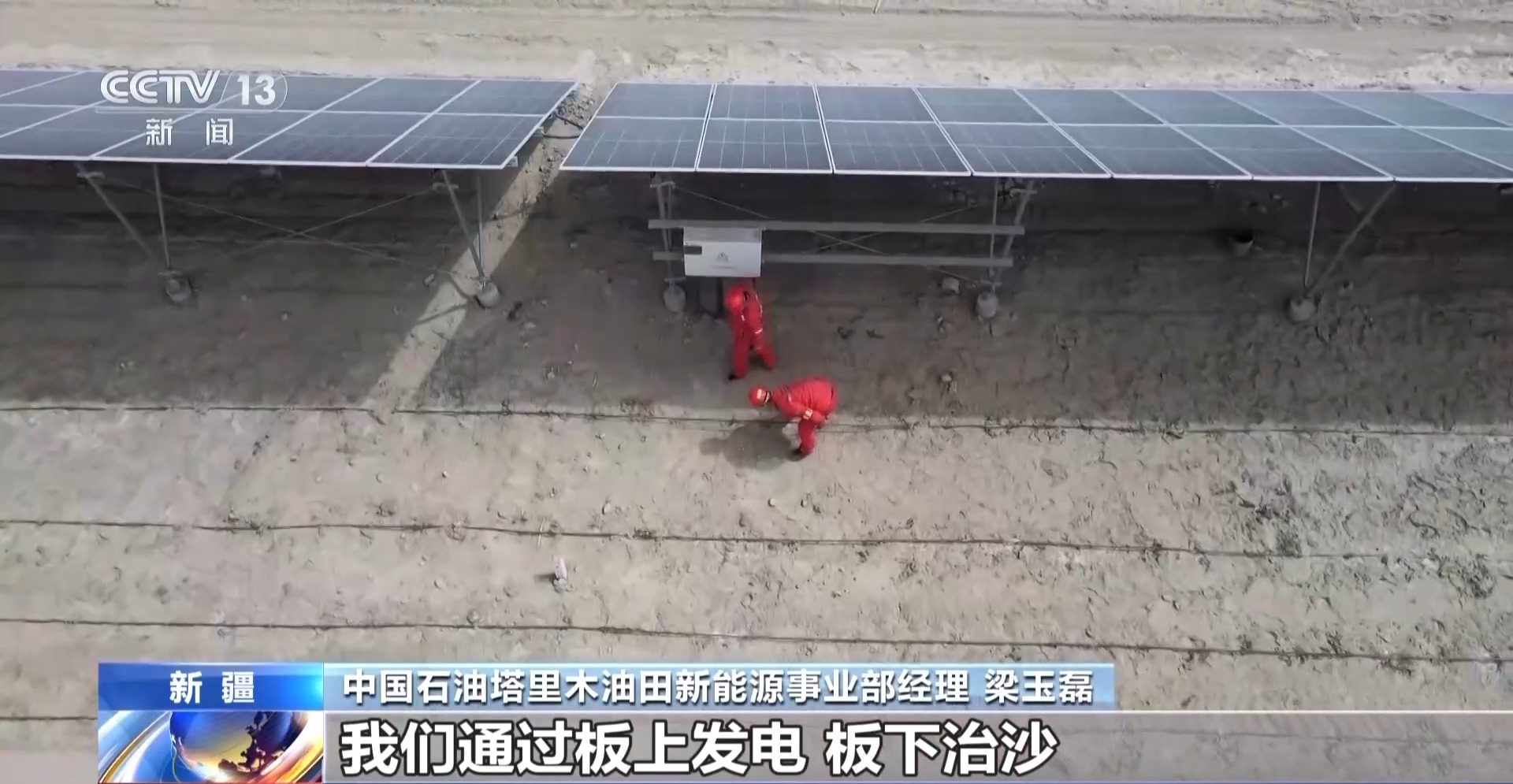 中國石油塔里木油田新能源事業(yè)部經(jīng)理 梁玉磊:我們通過板上發(fā)電、板下治沙,建設(shè)光伏方陣32個,固沙面積達到4000畝。有效改變了小環(huán)境風速,形成“發(fā)電-固沙-惠民”一體模式。