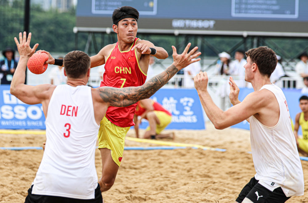 8月11日,中國隊(duì)球員任健豪(上)在比賽中進(jìn)攻。當(dāng)日,在2025年成都世運(yùn)會(huì)沙灘手球男子第5-8名安慰賽半決賽中,中國隊(duì)0比2不敵丹麥隊(duì)。新華社記者 劉坤 攝