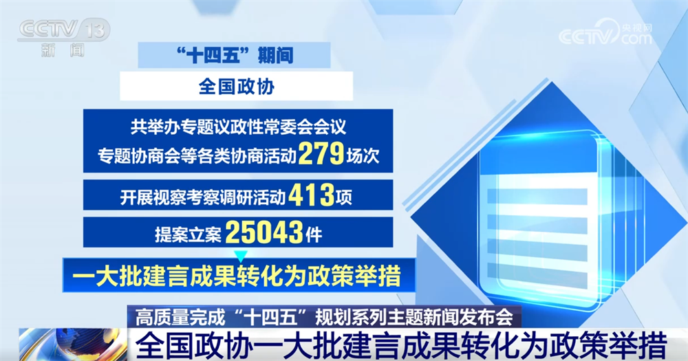 “十四五”期間,全國政協(xié)共舉辦專題議政性常委會會議、專題協(xié)商會等各類協(xié)商活動279場次,開展視察考察調(diào)研活動413項,提案立案25043件,一大批建言成果轉(zhuǎn)化為政策舉措。