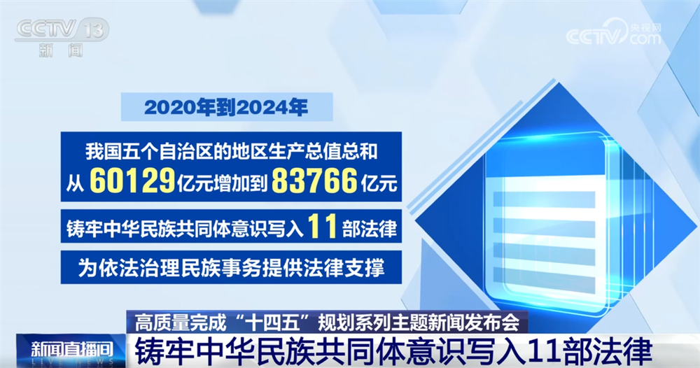 據(jù)了解,2020年到2024年,我國五個自治區(qū)的地區(qū)生產(chǎn)總值總和從60129億元增加到83766億元。鑄牢中華民族共同體意識寫入11部法律,為依法治理民族事務(wù)提供法律支撐。