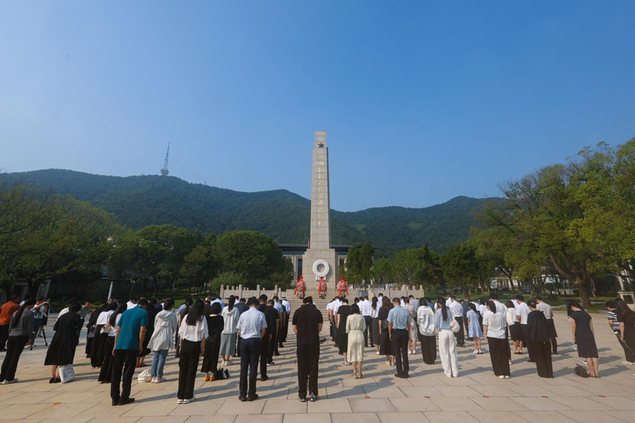8月21日上午,參賽選手們前往無錫市革命烈士陵園,向人民英雄紀念塔敬獻花籃。(海外網(wǎng) 謝明 攝)