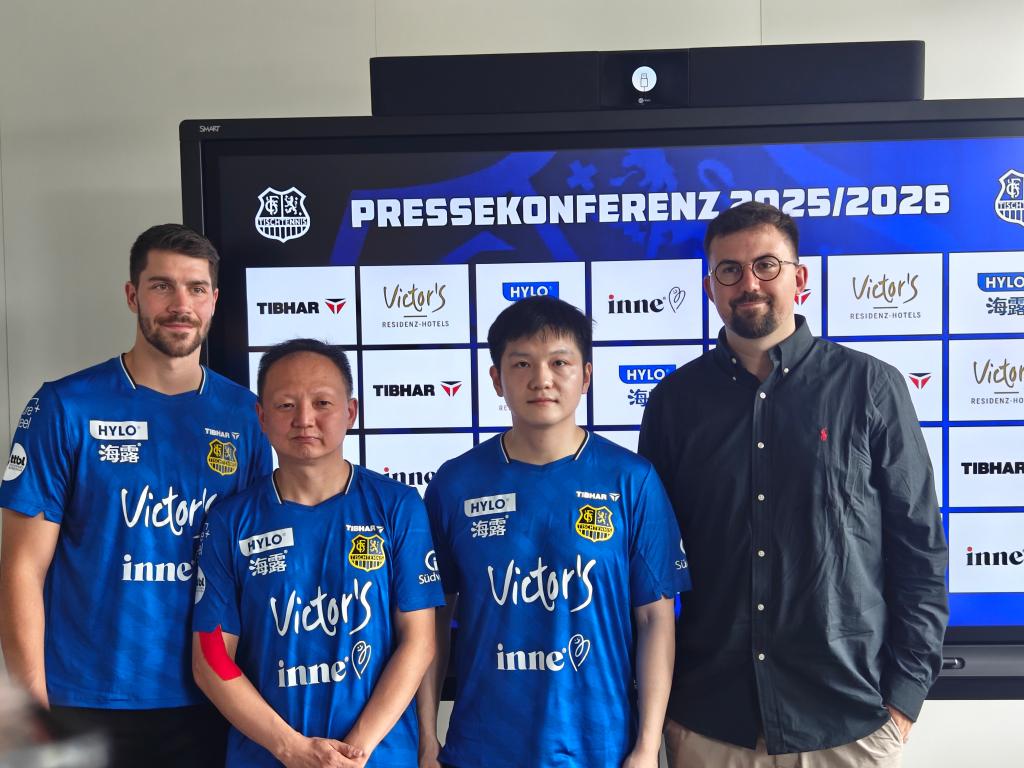 8月27日,中國(guó)乒乓球運(yùn)動(dòng)員樊振東(右二)出席德國(guó)乒乓球甲級(jí)聯(lián)賽薩爾布呂肯俱樂部的新賽季發(fā)布會(huì)。新華社記者 趙建通 攝
