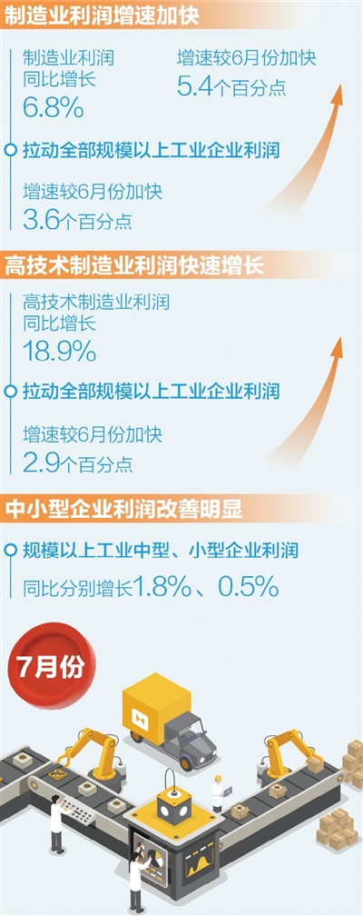 高技術(shù)制造業(yè)利潤快速增長,引領(lǐng)作用明顯。7月份,高技術(shù)制造業(yè)利潤由6月份下降0.9%轉(zhuǎn)為增長18.9%,拉動全部規(guī)模以上工業(yè)企業(yè)利潤增速較6月份加快2.9個百分點(diǎn),引領(lǐng)作用明顯。其中,航空航天器及設(shè)備制造行業(yè)利潤增長40.9%,生物藥品制造、化學(xué)藥品制劑制造等行業(yè)利潤分別增長36.3%、6.9%。