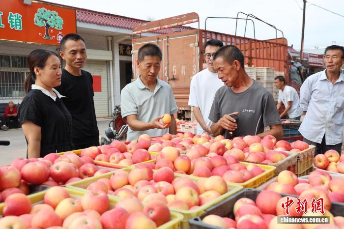 村內(nèi)采摘忙不停,村外交易同樣火熱。在洛川縣永鄉(xiāng)鎮(zhèn)東井村蘋果物流交易市場(chǎng),一筐筐剛從果園運(yùn)來的早熟蘋果整齊碼放,稱重、記賬、裝車等環(huán)節(jié)有條不紊,購(gòu)銷兩旺的場(chǎng)景格外熱鬧。