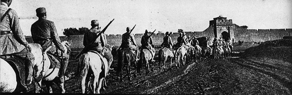 1945年8月,中國(guó)抗日武裝力量向日軍發(fā)起全面反攻。圖為八路軍晉綏部隊(duì)解放興和城,騎兵部隊(duì)列隊(duì)進(jìn)城。新華社發(fā)