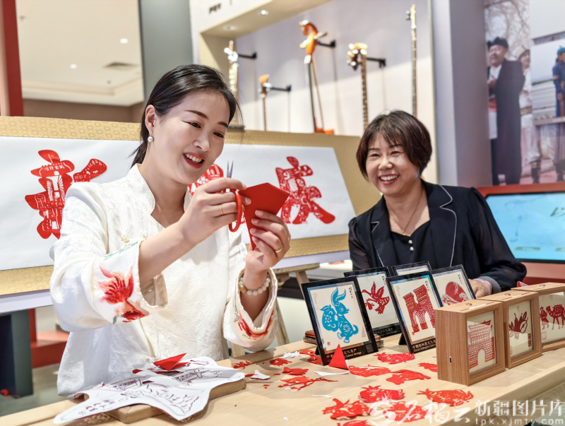 9月8日,剪紙藝人在巴州鑄牢中華民族共同體意識(shí)主題展館表演剪紙技藝。