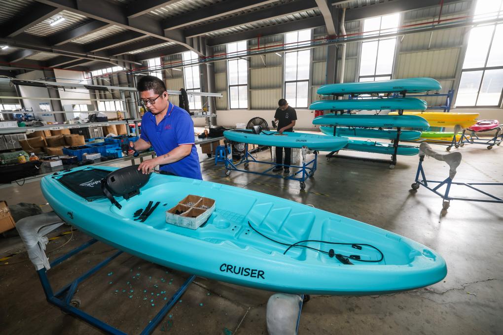 6月25日,在位于慈溪市的浙江酷爾智能科技有限公司的車間內(nèi),工人在加工出口的皮劃艇。新華社記者 徐昱 攝
