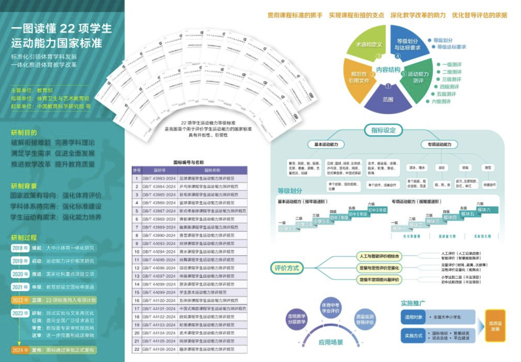 去年5月,由中國教育科學(xué)研究院牽頭研制的22項(xiàng)《規(guī)范》發(fā)布,為中國學(xué)生運(yùn)動(dòng)能力等級(jí)提供了國家標(biāo)準(zhǔn)。這意味著長(zhǎng)期困擾學(xué)校的運(yùn)動(dòng)能力評(píng)價(jià)無標(biāo)準(zhǔn)、課程缺乏銜接性問題,有望通過國家標(biāo)準(zhǔn)得以破解。