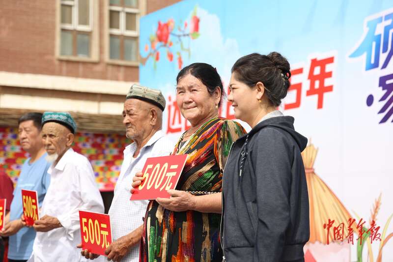 9月9日,新疆巴州尉犁縣興平鎮(zhèn)達(dá)西村,一場(chǎng)慶豐收活動(dòng)上,達(dá)西村黨委書(shū)記夏提古麗·熱合曼(右一)代表村集體向該村長(zhǎng)者發(fā)放慰問(wèn)金。通過(guò)棉花種植、文化旅游等,2024年達(dá)西村集體收入達(dá)230.55萬(wàn)元。中青報(bào)·中青網(wǎng)記者 王鑫昕/攝