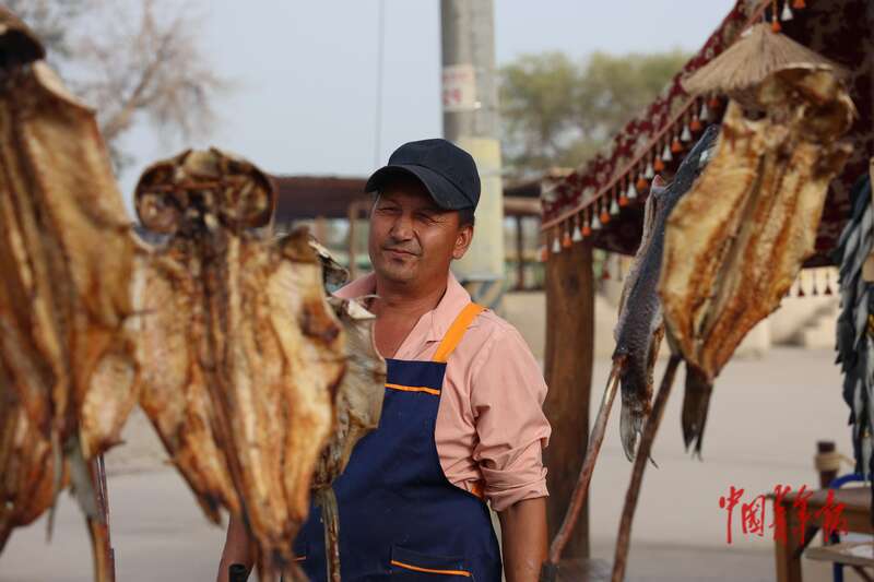 9月9日,新疆巴州尉犁縣羅布人村寨景區(qū),一位店主在現(xiàn)烤草魚(yú)。在尉犁縣,羅布人村寨在旅游扶貧、旅游惠民、旅游興縣等方面發(fā)揮著龍頭作用,景區(qū)從業(yè)人員80%以上是當(dāng)?shù)剞r(nóng)牧民。中青報(bào)·中青網(wǎng)記者 王鑫昕/攝