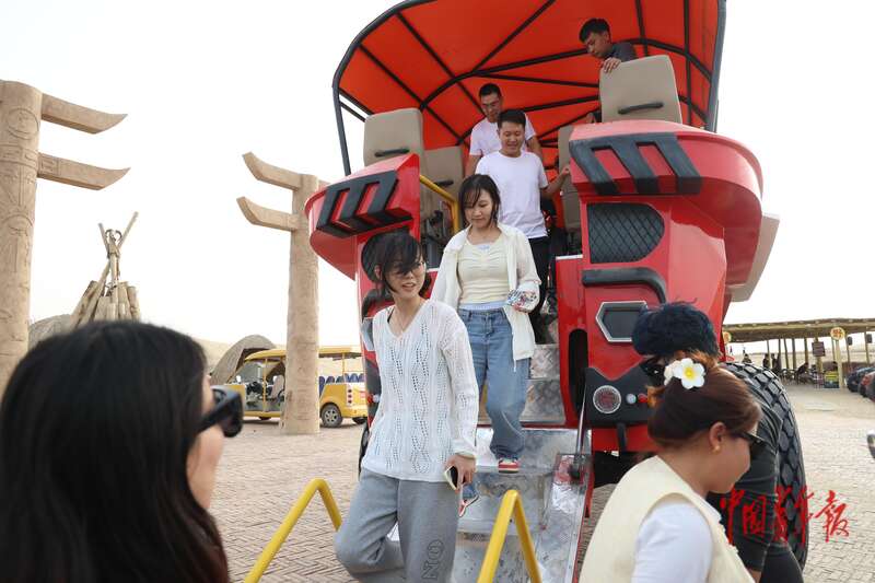 9月9日,新疆巴州尉犁縣羅布人村寨景區(qū),游客們走下被稱(chēng)為“大腳怪”的沙漠觀光車(chē)。中青報(bào)·中青網(wǎng)記者 王鑫昕/攝