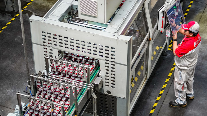 中糧可口可樂飲料(貴州)有限公司的工作人員在生產(chǎn)線旁進行操作(2025年8月24日攝)。
