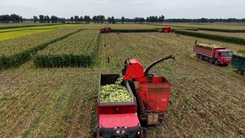 新疆巴音郭楞蒙古自治州焉耆縣的1.5萬(wàn)畝青貯玉米迎來(lái)豐收。在永寧鎮(zhèn)九號(hào)渠村,大型青貯收割加工機(jī)將一株株玉米從根部割斷,粉碎后拋入集草車(chē)。