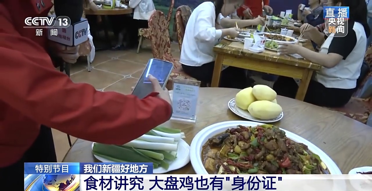 其實(shí),大盤(pán)雞里的每一種原料,都是新疆農(nóng)業(yè)發(fā)展的縮影。先說(shuō)這最主要的雞肉,是來(lái)自當(dāng)?shù)貥?biāo)準(zhǔn)化散養(yǎng)的土雞,這可不是一般的雞,它讓大盤(pán)雞有了“電子身份證”,我們來(lái)掃碼看看。