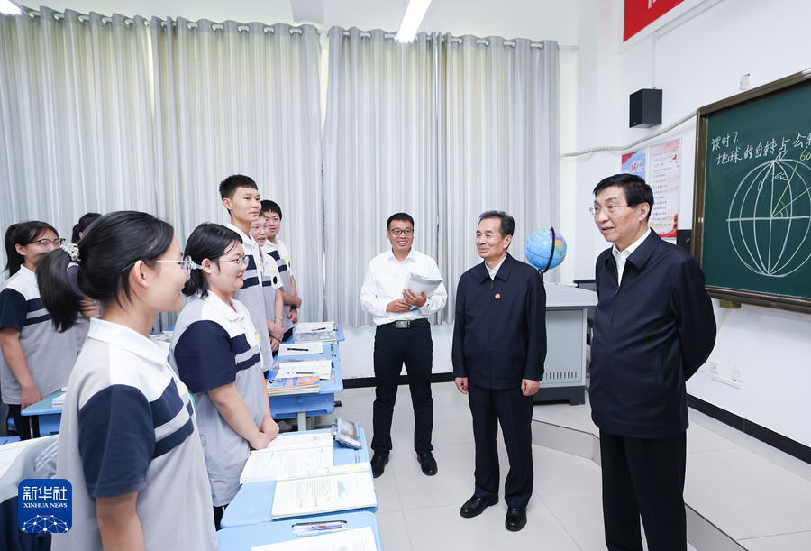 9月25日下午,受習(xí)近平總書記囑托,中共中央政治局常委、全國政協(xié)主席、中央代表團(tuán)團(tuán)長王滬寧帶領(lǐng)中央代表團(tuán)部分成員在巴音郭楞蒙古自治州庫爾勒市看望慰問當(dāng)?shù)馗髯甯刹咳罕姟_@是王滬寧和中央代表團(tuán)部分成員在庫爾勒市第二十三中學(xué)考察教育援疆情況。新華社記者 姚大偉 攝