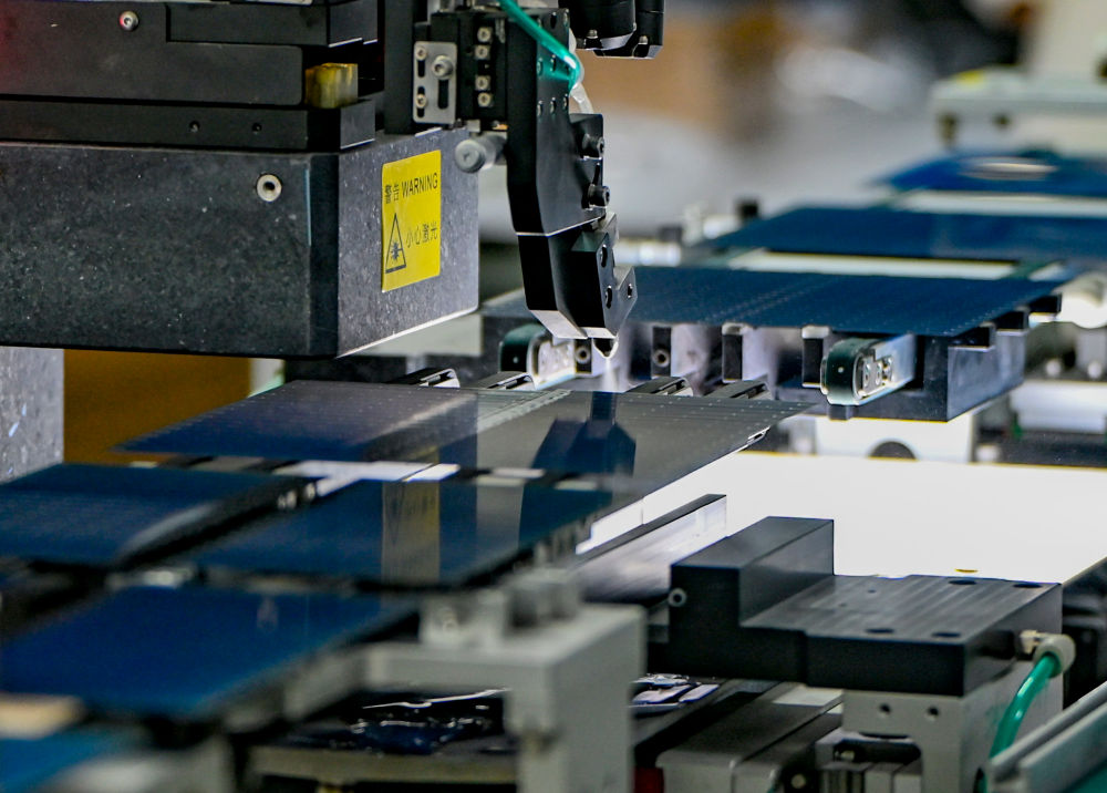 9月22日,在新疆巴音郭楞蒙古自治州若羌縣的國晟企誠新能源有限公司,全自動劃片機在切割光伏電池片。