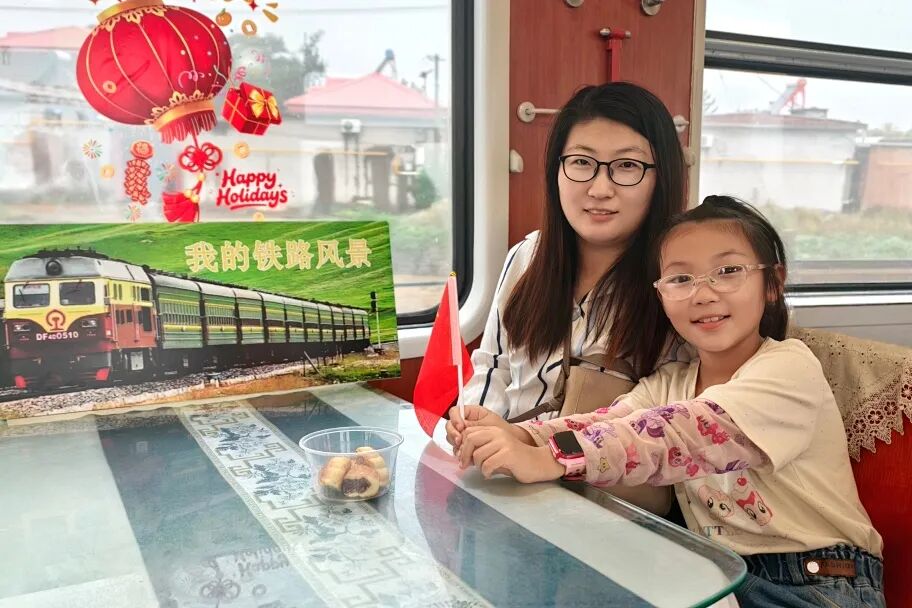車廂內(nèi)掛滿條幅、彩帶和中國結(jié),洋溢著節(jié)日的喜慶氛圍。在舞蹈《親愛的你啊》的優(yōu)美旋律中,列車聯(lián)歡拉開序幕。