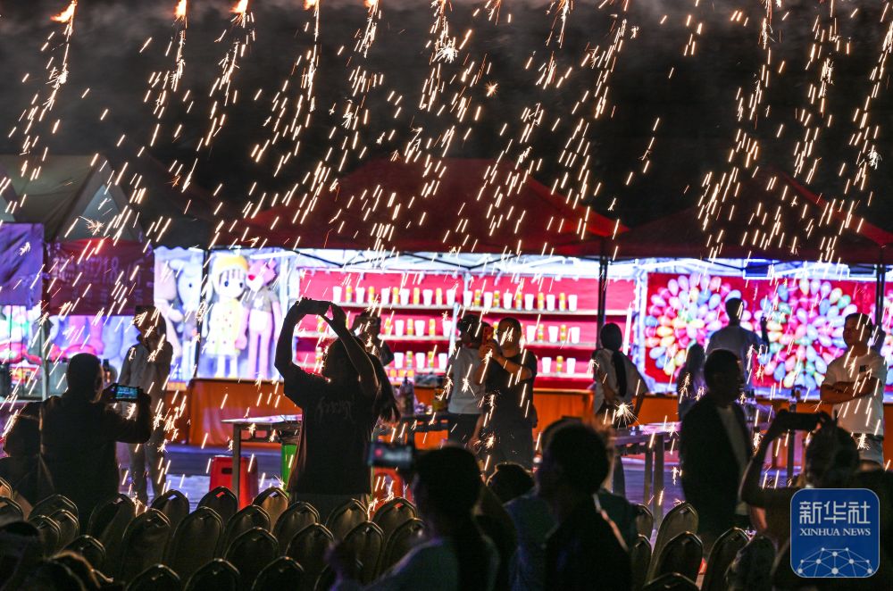 ↑ 10月5日晚,游客在貴州省晴隆縣阿妹戚托小鎮(zhèn)觀(guān)看焰火表演。新華社記者 楊文斌 攝