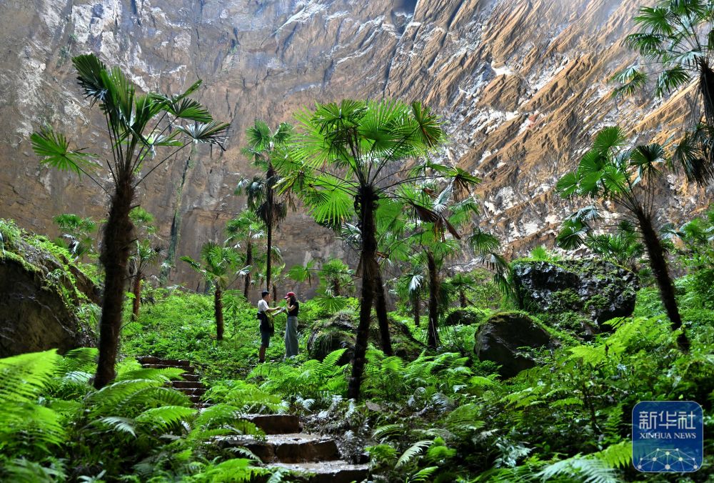 ↑ 10月6日,游客在湖北省宣恩縣矅天眼景區(qū)深達(dá)290余米的鑼圈巖天坑底部觀(guān)光游玩。新華社發(fā)(宋文攝)