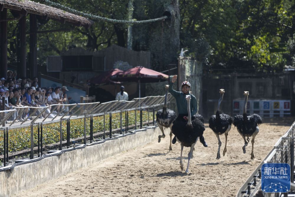 ↑ 10月6日,人們?cè)谏虾R吧鷦?dòng)物園觀(guān)看奔跑中的鴕鳥(niǎo)。新華社記者 王翔 攝