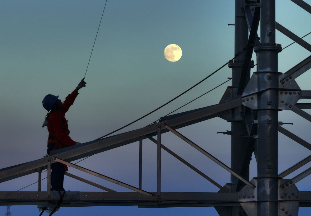 10月6日,在湖南省衡陽市雁峰區(qū),高塔架線工人在月光的映射下施工(無人機照片)。新華社發(fā)(曹正平攝)