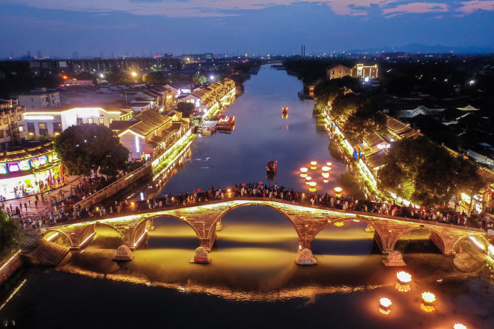 10月2日,游客在塘棲古鎮(zhèn)的廣濟(jì)橋觀賞運(yùn)河夜景(無人機(jī)照片)。 新華社記者 徐昱 攝