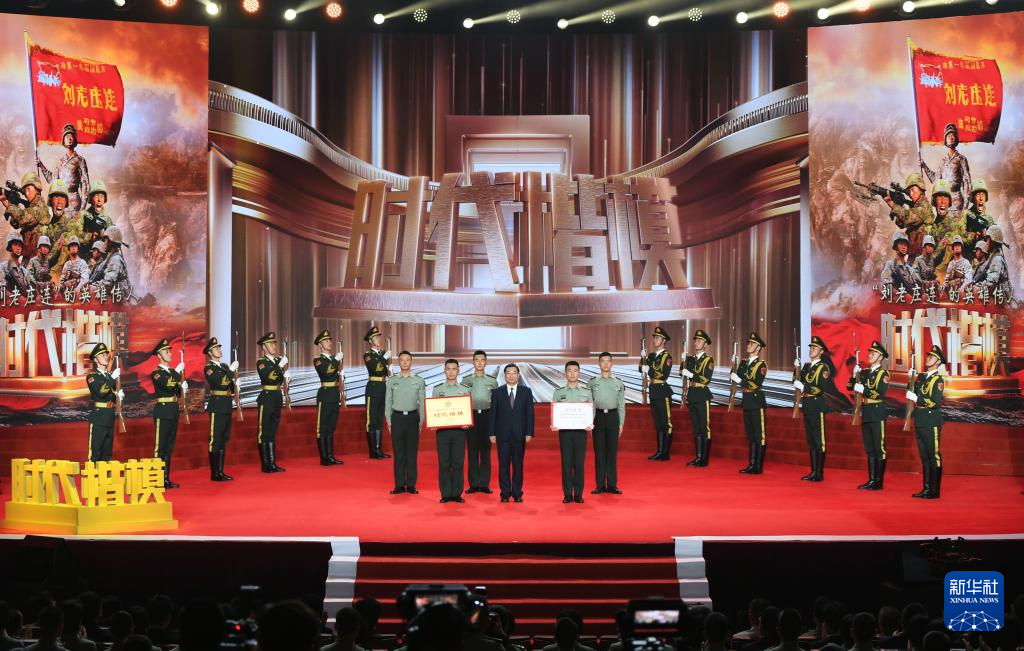 在“時(shí)代楷模”發(fā)布儀式上,陸軍某合成旅合成二營(yíng)裝甲步兵一連(“劉老莊連”)官兵代表領(lǐng)取“時(shí)代楷?!豹?jiǎng)牌和證書(9月29日攝)。新華社發(fā)(華夏 攝)