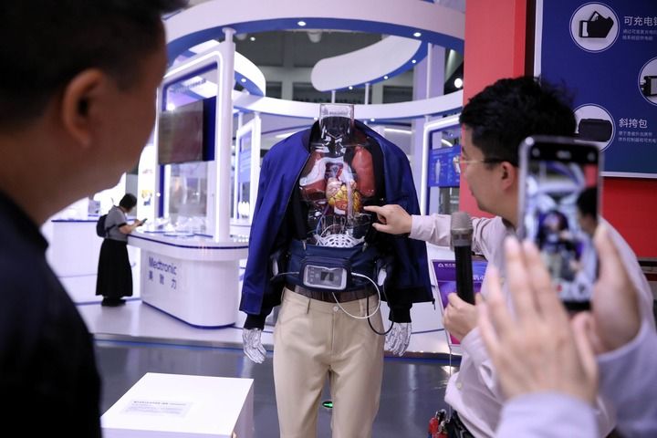 2025年9月24日,在海南博鰲“永不落幕”國際創(chuàng)新藥械展,工作人員為參觀者介紹植入式左心室輔助系統。新華社記者 鄭悅 攝
