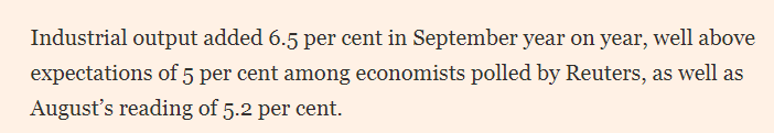 英國(guó)《金融時(shí)報(bào)》的文章分析說(shuō),9月規(guī)模以上工業(yè)增加值同比增長(zhǎng)6.5%,顯著高于路透社調(diào)查經(jīng)濟(jì)學(xué)家預(yù)期的5%及8月的5.2%。荷蘭國(guó)際集團(tuán)(ING)經(jīng)濟(jì)學(xué)家分析稱(chēng),超預(yù)期表現(xiàn)主要源于外需拉動(dòng)。文章說(shuō),上周,海關(guān)數(shù)據(jù)顯示,中國(guó)出口保持韌性,9月同比增長(zhǎng)8.3%,對(duì)東南亞等地區(qū)出口持續(xù)增長(zhǎng)。