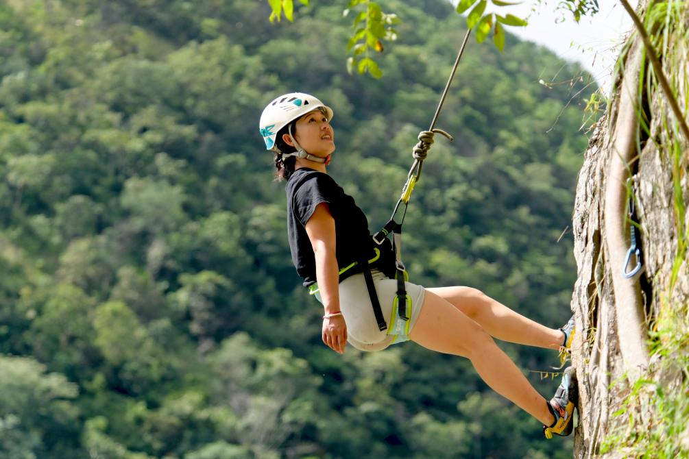 10月4日,游客在云南大理南澗彝族自治縣公郎鎮(zhèn)猛龍渡體驗“攀巖”運(yùn)動。新華社發(fā)(適志宏 攝)