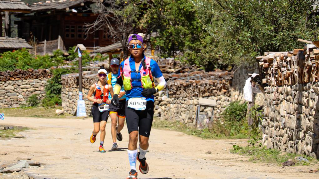 9月27日,首屆巴松措山地越野跑在西藏林芝市工布江達(dá)縣巴松措風(fēng)景區(qū)舉行,圖為參賽選手穿過古村落錯高村。新華社記者 格桑朗杰 攝