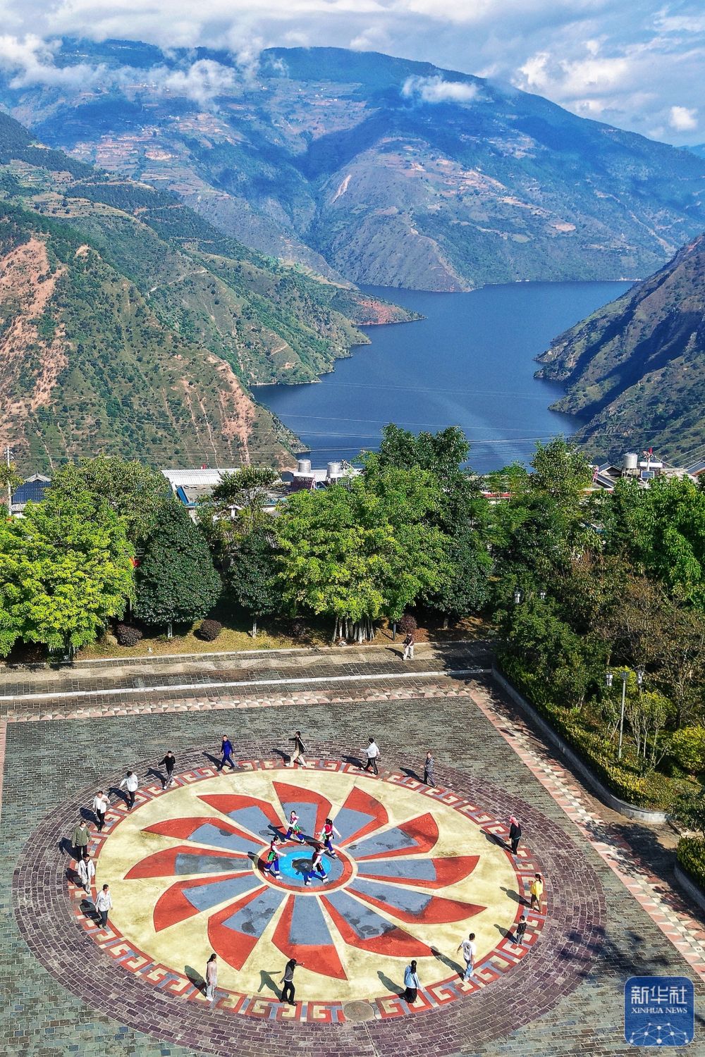 ↑ 10月31日,小灣東鎮(zhèn)居民在瀾滄江畔的移民廣場(chǎng)休閑(無人機(jī)照片)。