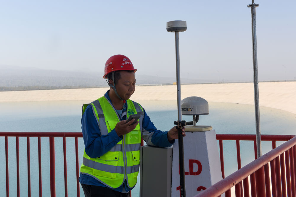 ↑ 11月1日,施工人員在奧吞勒克水庫檢查閘控系統(tǒng)設(shè)備試運行情況。