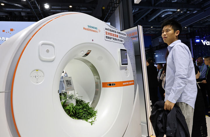 2025年11月6日,參觀者在進博會西門子公司展臺一個CT機展品旁駐足觀看,這是西門子公司首款國產(chǎn)雙源光子計數(shù)CT,也是該產(chǎn)品亞洲首發(fā)首展。新華社記者 方喆 攝
