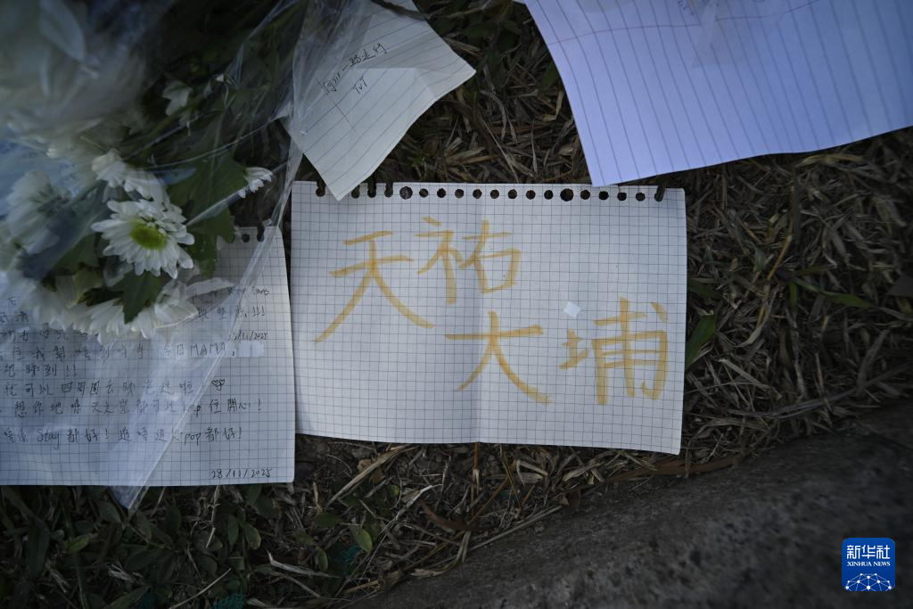 這是11月29日清晨在火災(zāi)后的大埔宏福苑樓宇附近拍攝的市民擺放的花束與留言條。新華社發(fā)(王申攝)