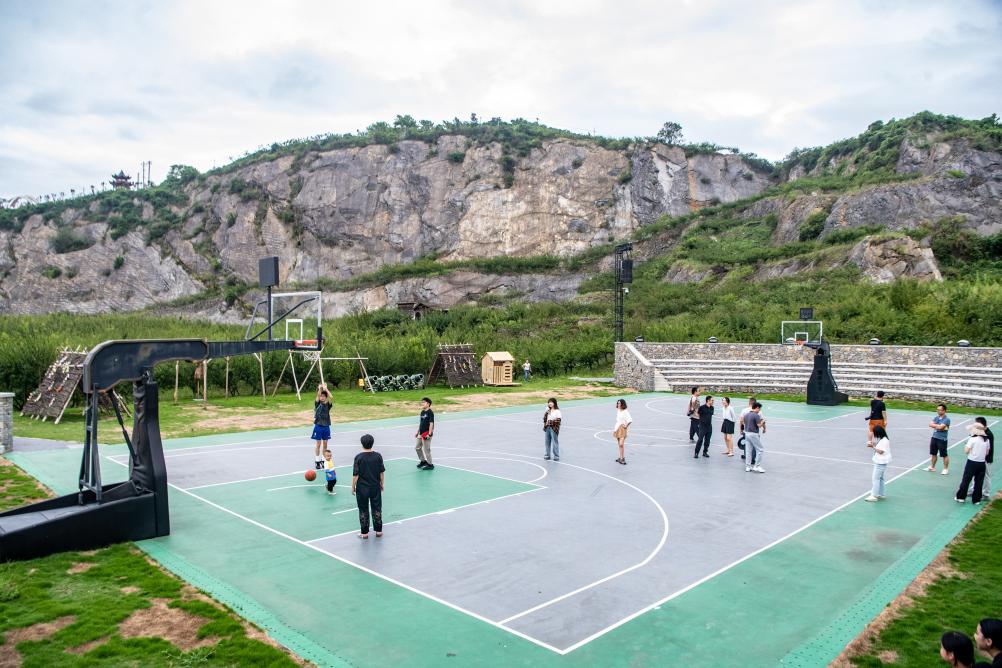 2025年8月16日,在重慶市北碚區(qū)靜觀鎮(zhèn)中華村,游客在礦坑修復改造的運動場內打球。新華社記者 唐奕 攝