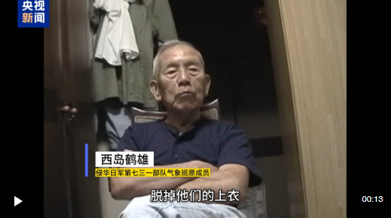 侵華日軍第七三一部隊氣象班原成員 西島鶴雄:脫掉他們的上衣,讓他們光著身子,放在零下20攝氏度甚至零下25攝氏度的環(huán)境里,放5分鐘或10分鐘。