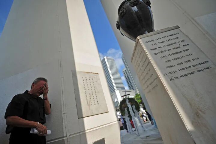 2015年2月15日,一位市民在新加坡美芝路戰(zhàn)爭紀(jì)念公園舉行的祭禮上悼念死難者。當(dāng)日,新加坡中華總商會(huì)舉行第48屆悼念日本占領(lǐng)時(shí)期死難人民祭禮。新華社發(fā)(鄧智煒攝)