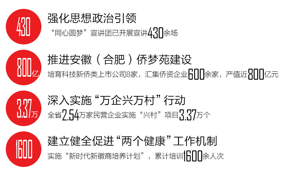 堅持和落實“兩個毫不動搖”,建立健全促進(jìn)“兩個健康”工作機(jī)制。持續(xù)優(yōu)化民營經(jīng)濟(jì)發(fā)展環(huán)境,促進(jìn)經(jīng)濟(jì)社會高質(zhì)量發(fā)展。召開全省民營經(jīng)濟(jì)統(tǒng)戰(zhàn)工作會議,明確36項重點(diǎn)任務(wù)和55家責(zé)任單位,建立13家省直單位組成的聯(lián)席會議制度。聚焦凝心鑄魂,全省統(tǒng)戰(zhàn)系統(tǒng)累計開展理想信念教育和經(jīng)濟(jì)形勢政策教育808場次,覆蓋3.82萬人次民營經(jīng)濟(jì)人士。突出年輕一代培育,實施“新時代新徽商培養(yǎng)計劃”,累計培訓(xùn)1600余人次,建立約2500人的代表人士數(shù)據(jù)庫,推動青年商會組織省市全覆蓋,推薦4300余名優(yōu)秀青年企業(yè)家進(jìn)入各級人大、政協(xié)。引導(dǎo)企業(yè)履行社會責(zé)任,完成光彩事業(yè)發(fā)起實施30周年相關(guān)調(diào)研及先進(jìn)典型推薦宣傳工作。