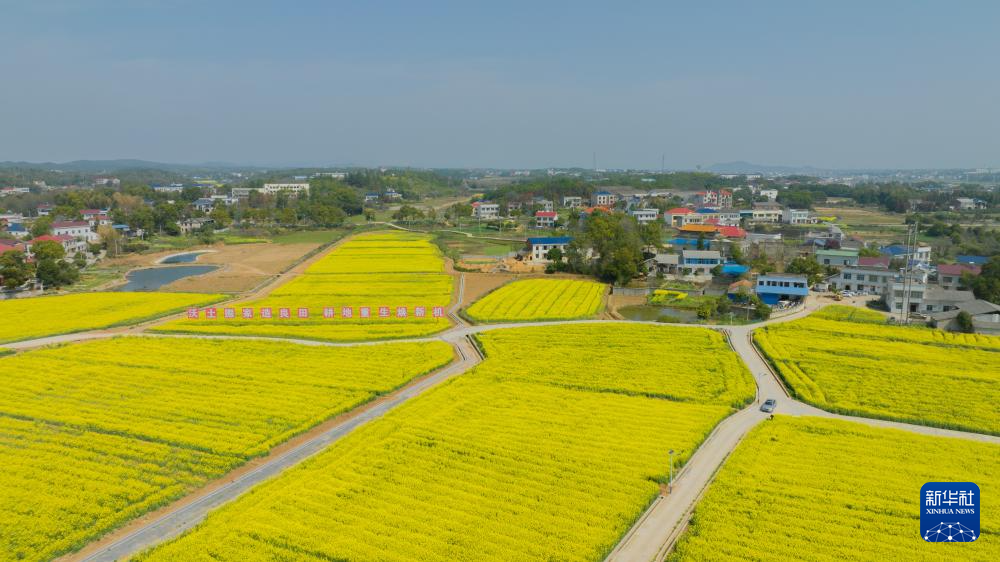 這是2023年3月10日拍攝的瀏陽市永安鎮(zhèn)豐裕村改良后耕地上的油菜花(無人機照片)。新華社發(fā)