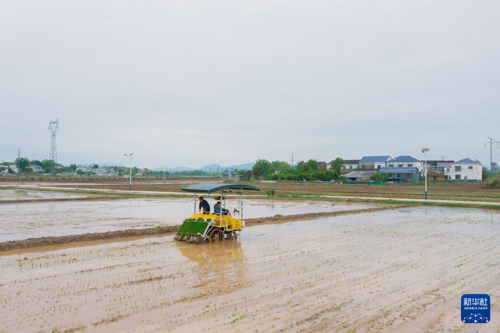 2024年6月19日,在瀏陽市永安鎮(zhèn)豐裕村改良后的耕地上,村民操作機械插秧。新華社發(fā)
